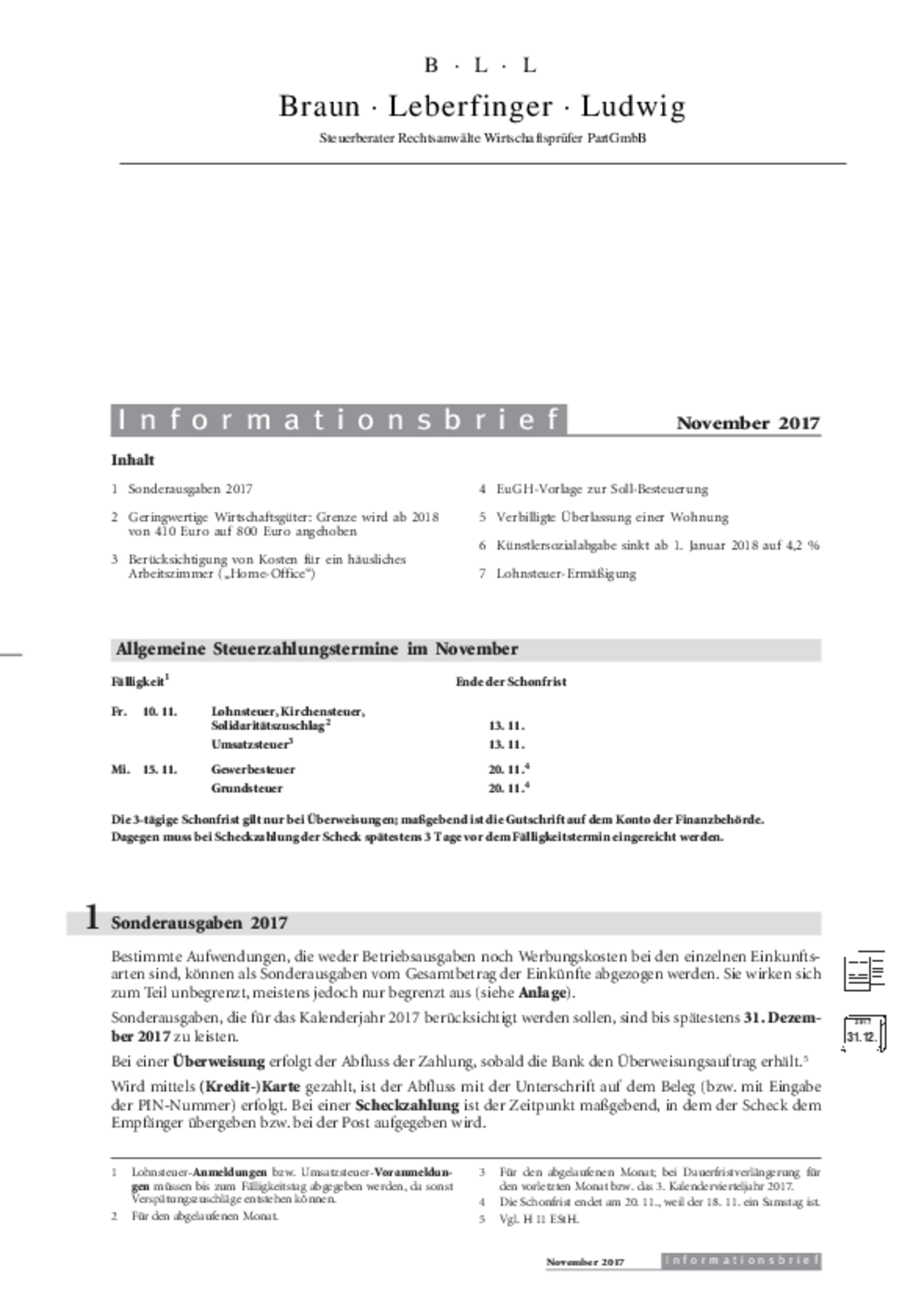 - Geringwertige Wirtschaftsgüter: Grenze wird ab 2018 von 410 Euro auf 800 Euro angehoben